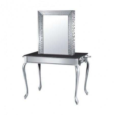 Post de lucru cu fata dubla, din oglinda cu rama inox cu incrustatii si etajera din inox cu picioare,